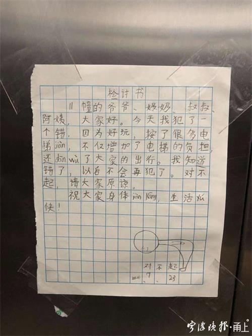 給誰造成麻煩了,就得向誰道歉。耽誤鄰居們上班了,檢討書就得讓鄰居們看到。于是,23日一早6點30分,趙女士就催著兒子起床,讓他去11幢的電梯間把檢討書貼好。