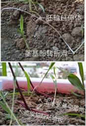 這次試驗(yàn),在報(bào)告里有各種數(shù)據(jù)都列表統(tǒng)計(jì)。為了讓讀者直觀地看清什么是“軸延體”(有人稱“中胚軸”或“根莖”),我選了兩張照片作成拼圖(圖6的上、下)。