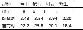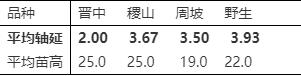 從表中可以看出:晉中高粱的軸延體明顯比其它都短,其它都﹥3,而它﹤3?,F(xiàn)在用它跟其它3種比較,所占百分比分別為:是稷山的68.5%;周坡的68.8%;野生的77.6%。苗高則為晉中﹥野生﹥周坡﹥稷山。