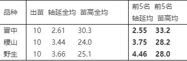 ③按苗高平均值排列:周坡39.5;北黑32.7;老灰27.0;新灰24.5;小黑21.2cm。“苗高”是指從莖基部,到***長葉子的葉尖的長度。